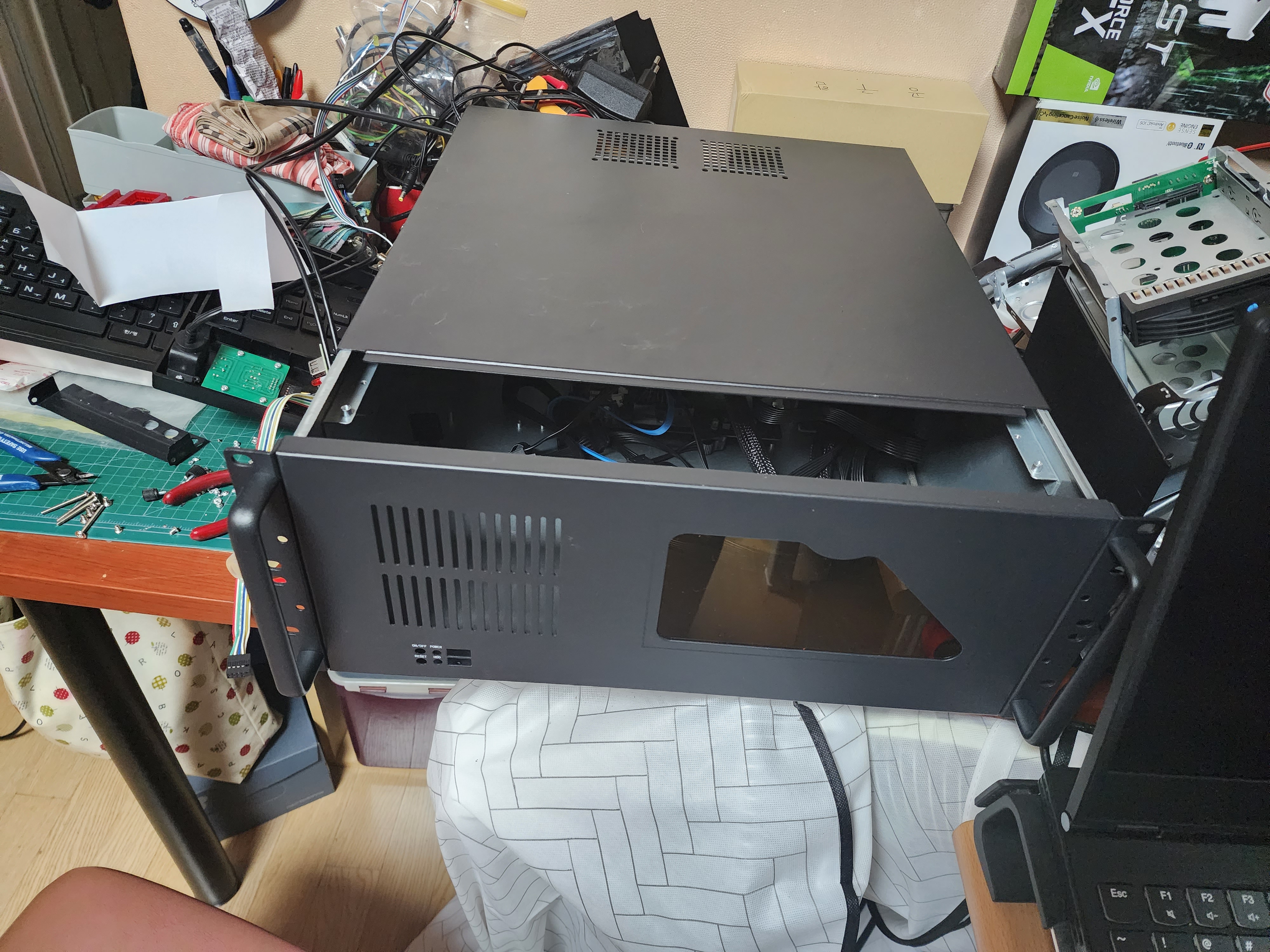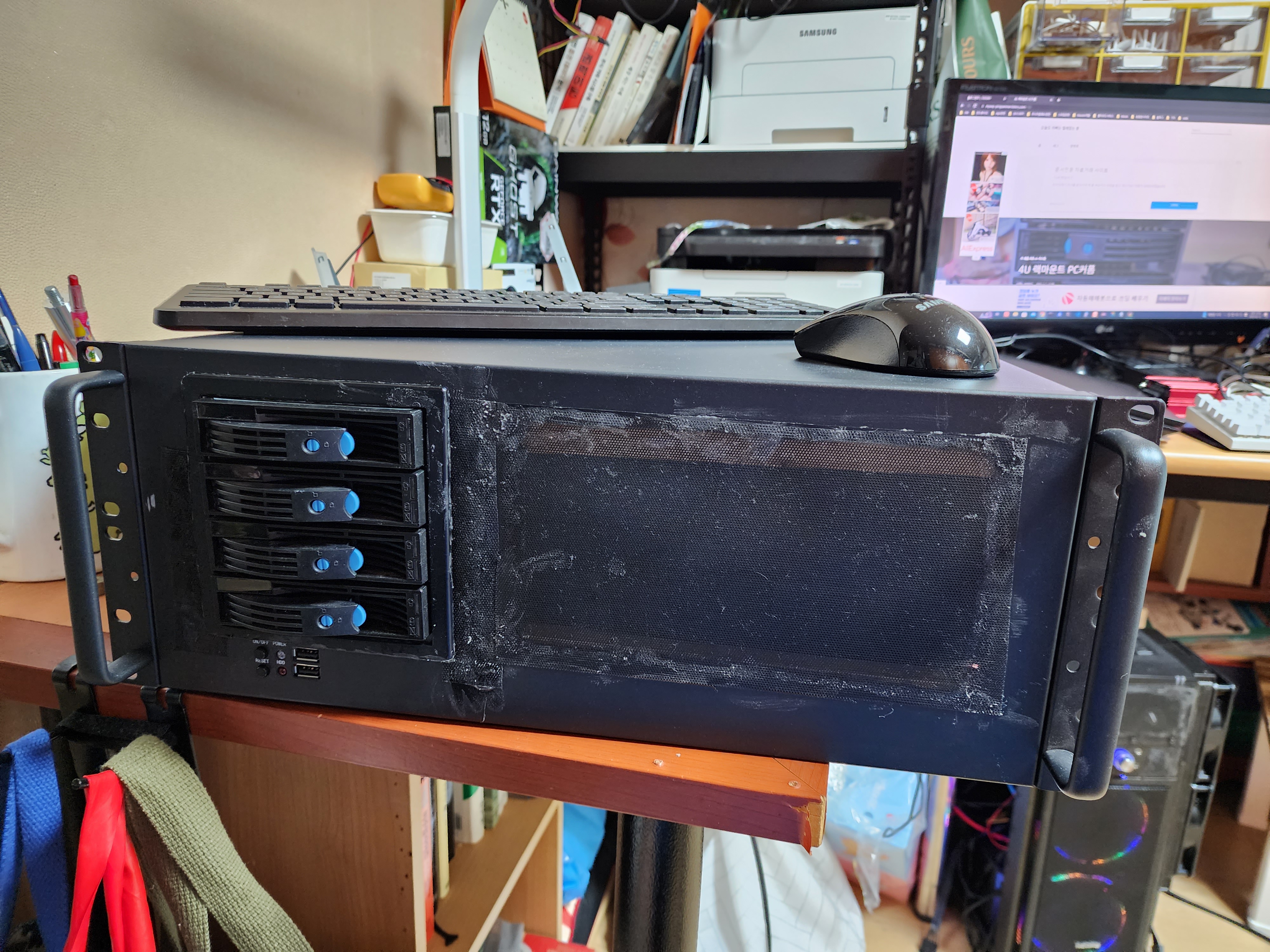 완성된 모습입니다. 팬 소음이 장난아닙니다. 지나번에 자작한 서버 팬소음 때문에 PWM달고 난리를 쳤는데 그때 소음은 명함도 못 내밀 수준이네요. 조만간 서버실 구하면 다시한번 공유드리겠습니다.