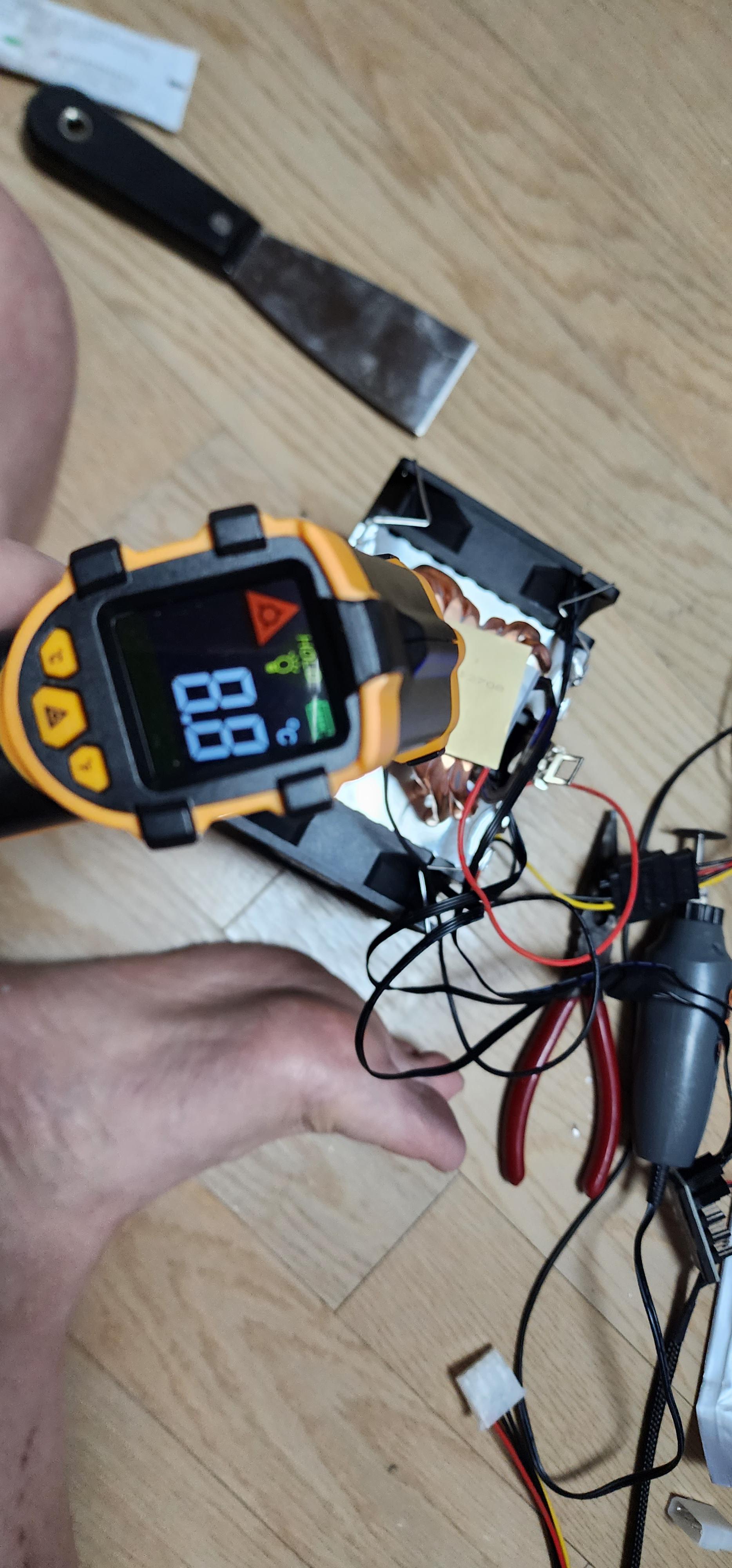 펠티에는 두가지 성질이 다른 금속이 에너지를 내면 한쪽은 차가워지고 한쪽은 뜨거워지는 성질을 전기적 회로로 만든 것입니다. 그래서 반듯이 한쪽에는 쿨러가 있어야 합니다. 쿨러와 펠티에를 같이 사용하면 빠른 속도로 온도가 내려 갑니다. 위의 그림은 6파이프 히트싱크 쿨러위에 아무 써멀없이 펠티에에 전원을 가한 모습입니다.