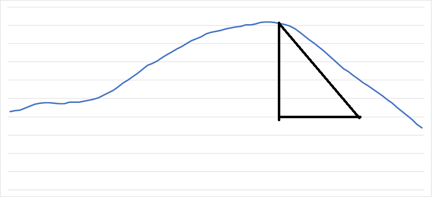 2장에 나오는 class Auxiliary 에 위 부분을 추가하면 이제는 각 보조 지표들에 대하여 하락 중인지 상승 중인지를 알 수 있습니다. 저 같은 경우는 이 블로그 초기에 5분 데이터를 버리고 지금은 1분 데이터를 사용하고 있으며 1200분의 이동평균선(이하 sma1200)을 주로 이용하고 있고 이 값은 현재 급변하는 비트코인 시장에 너무나도 잘 맞고 있습니다. 신기할 정도입니다. sma1200의 각도인 sma1200_degrees는 위의 식을 잘 응용하신다면 쉽게 구하셨을 거라고 생각합니다. 그리고 제 프로그램에 위의 식을 이용하여 sma1200_degrees가 30 º 를 초과하면 급등 구간으로 정의하고 40 º 를 초과하면 급급등 구간으로 정의했습니다. 그래서 30 º초과하는 경우 조건식이 뭐건 상관없이 무조건 매수하게 했습니다. 40 º 를 초과하면 절대로 매도를 안 하는 거죠. 왜냐면 계속 오를 테니까요? 하지만 여기에는 문제가 있습니다. 우리가 파도를 타는 사람이라고 생각하면 무엇보다도 바람의 방향이 중요합니다. 바람의 방향을 무시하면 생명과 직결되는 문제가 발생합니다. 바람의 방향이 바뀌면 바로 모든 것을 버리고 해변으로 나와야 하죠. 순풍이라고 신이 나서 죽음이 다가오고 있는지 모르고 즐기고 있다면 죽음의 신이 바로 옆에 있는데 춤을 추는 꼴이겠죠. 그래서 제가 생각한 값이 곡선의 밑면과 닫는 넓이입니다. 밑변은 840분 동안의 최저가를 사용했습니다. 그리고 우리는 위의 각도를 알고 있기 때문에 곡선에서 90 º로 내린 선과 곡선의 기울기를 이용한 각도인 sma1200_degrees와 840분 동안의 최저가를 이용하면 하나의 직각 삼각형을 구할 수 있다는 것을 쉽게 이해하실 겁니다.